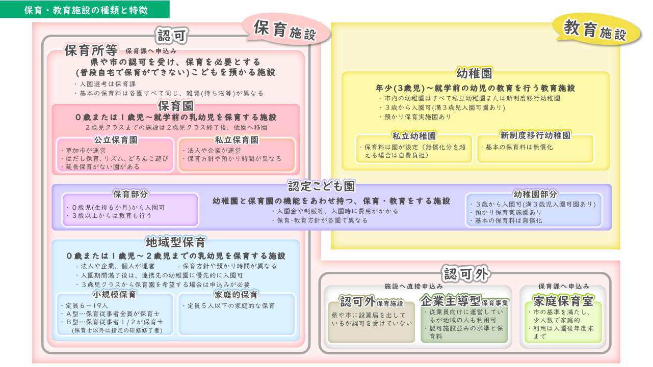 保育園や幼稚園への入園を考えているママ・パパのために、草加市にある保育・教育施設の種類と、各施設の入園年齢、保育方針、費用などの特徴について、草加市公式チャンネルで公開しています。